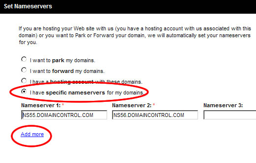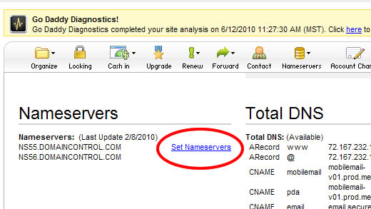 在域名管理面板中,點(diǎn)下拉框,在Nameservers管理項(xiàng)目下,點(diǎn)選Set Nameservers連接,進(jìn)入DNS設(shè)置菜單