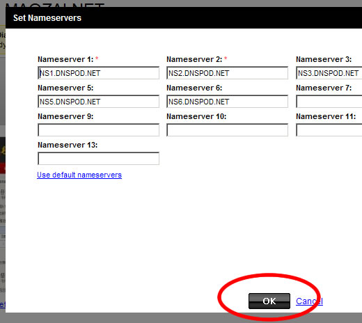 填寫dnspod給出的六組dns服務(wù)器地址后,點(diǎn)擊確定(ok)即可,在dodaddy的設(shè)置完畢,靜等生效。